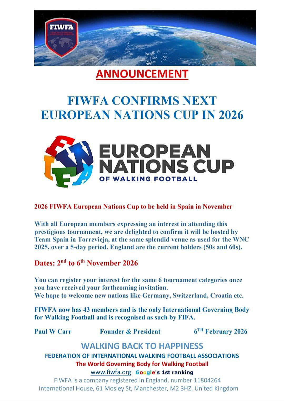 Spain Walking Football has been officially awarded the hosting rights for the 2026 FIWFA European Nations Cup, marking a major milestone for walking football and a significant boost for the sport’s rapidly growing profile across Europe.
